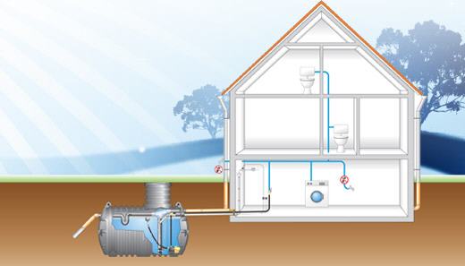 Wie im obigen Schaubild gezeigt, gelangt das Regenwasser vom Dach Ihres Hauses über das Fallrohr zum Vorfilter. Dort werden die groben Verunreinigungen wie Laub, Dachabrieb etc. abgeschieden. Vom Vorfilter aus fließt das Regenwasser in den eigentlichen Regenwasserspeicher. Dieser kann sowohl im Keller als auch im Freien aufgestellt, bzw. im Erdreich versenkt werden. Beim Einbau im Keller empfiehlt es sich, zur Vermeidung von Algenbildung einen Regenwasserspeicher aus lichtundurchlässigem Material zu verwenden. Soll der Speicher im Freien aufgestellt werden, ist UV-Stabilität unerläßlich. Wird der Regenwasserspeicher dagegen im Erdreich installiert, nimmt er keinen wertvollen Kellerraum in Anspruch und ist lichtgeschützt. Sobald Sie Regenwasser für ihren persönlichen Verbrauch benutzen (z.B. Vor- und Hauptwäsche, WC etc.), schaltet sich automatisch eine Pumpe ein. Diese fördert das gefilterte Regenwasser über eine Saugleitung, Siebkorb, Rückschlagventil und über einen Feinfilter (ca. 0,08 mm Maschenweite) zum Verbraucher. Wichtig ist, daß zur Förderung von Regenwasser ein von der Trinkwasserversorgung unabhängiges Rohrleitungsnetz benötigt wird. Bei sehr langen Trockenperioden stellt sich aufgrund des fehlenden Niederschlags im Regenwasserspeicher oftmals ein zu niedriger Wasserstand ein. Um die Wasserversorgung sicherzustellen, wird über eine automatische Nachspeisung eine Mindestmenge Trinkwasser zugeführt. Damit ist auch im Hochsommer eine zuverlässige Wasserversorgung gewährleistet. Ist der Regenwasserspeicher nach länger anhaltenden Regenfällen voll, wird das überschüssige Wasser über den Überlauf der Versickerung oder dem Abwasserkanal zugeführt.